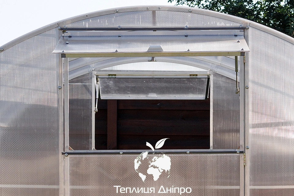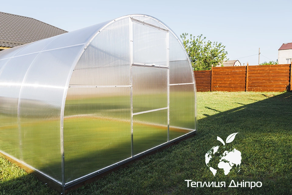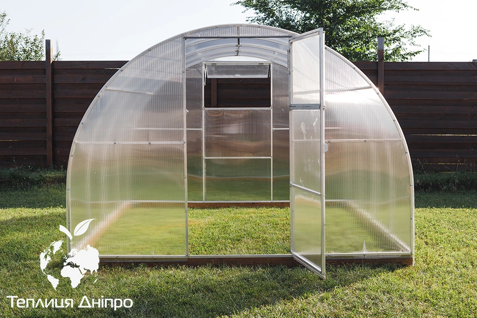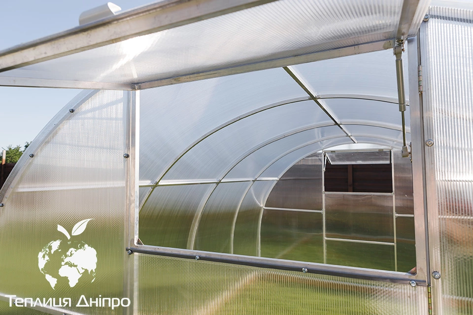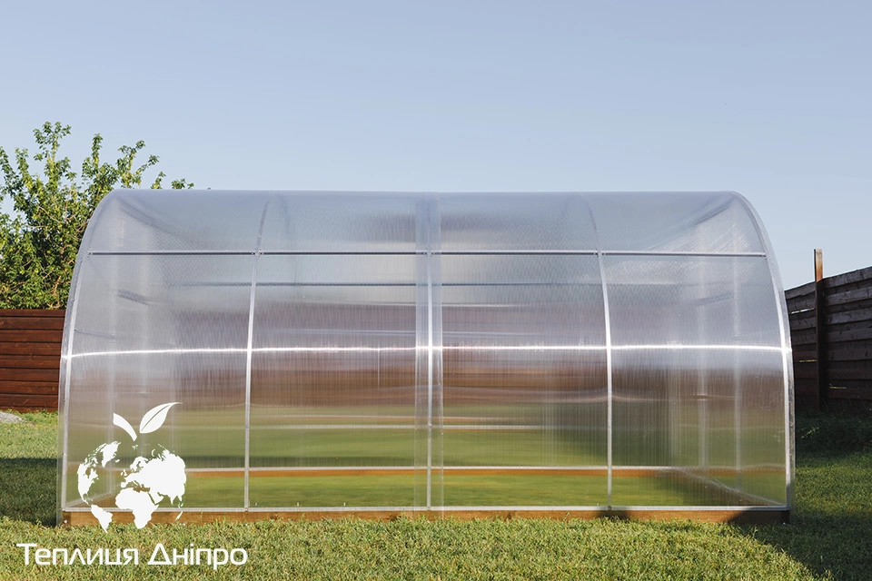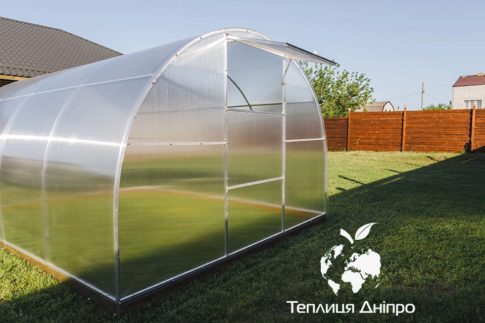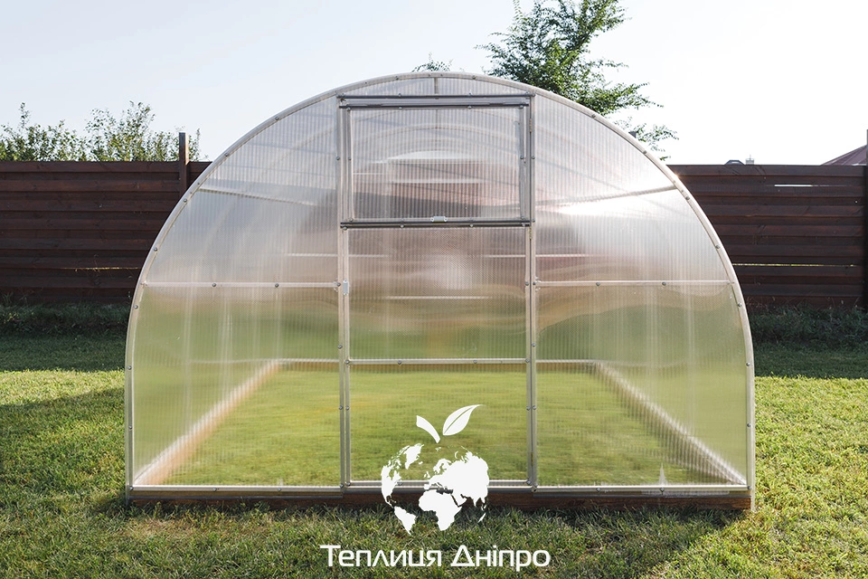 Покрывается теплица «Днепр» сотовым поликарбонатом 4мм. и более.